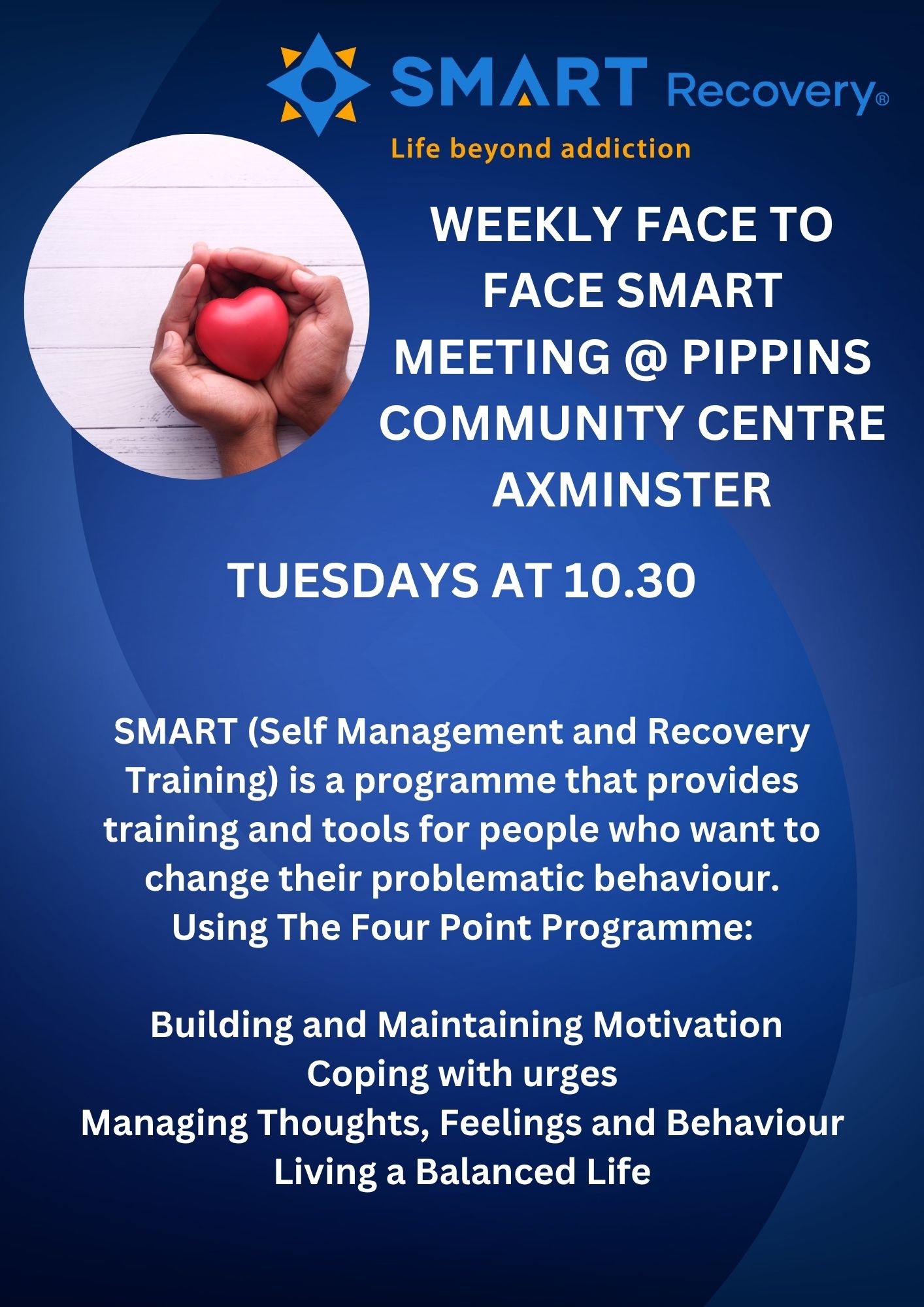 - Weekly in person SMART Recovery meetings (10:30am on Tuesdays)